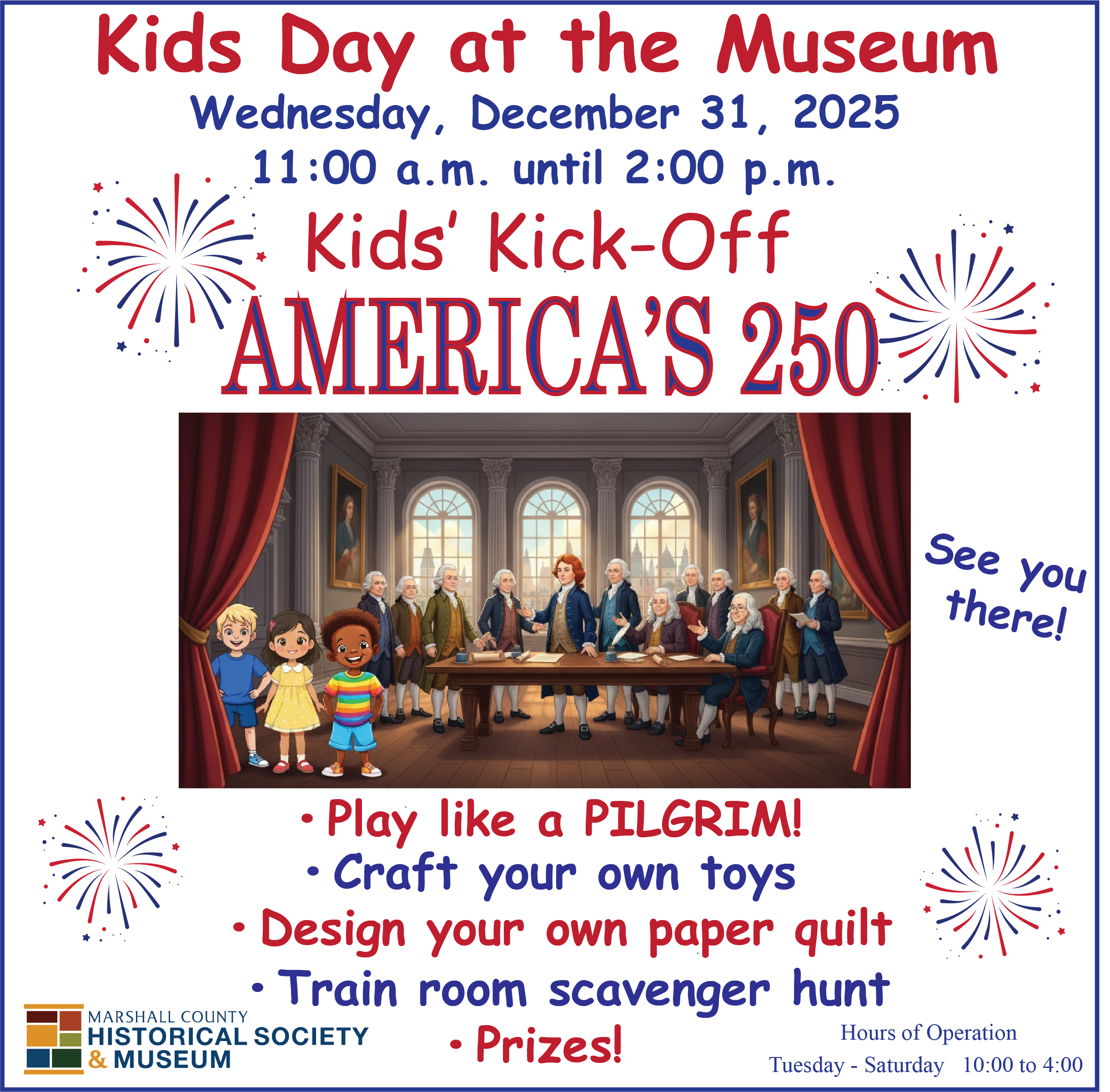 Bring the kids to the Museum on Wednesday, December 31 from 11:00 am to 2:00 pm for a festive Kids Day kicking off America’s 250th birthday! We will be crafting toys, designing paper quilts and going on scavenger hunts. Come for prizes and fun! We will also be playing games that caregivers can join in. “Smokey” the Engineer will be running the trains. We’d love to see YOU!